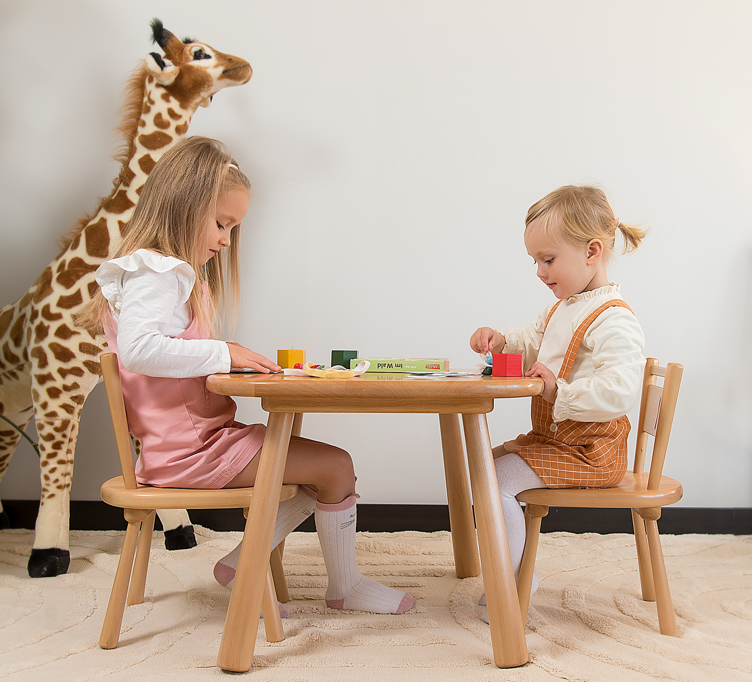 Wie bei unserem Tisch schützt die natürliche Beschichtung der Stühle nicht nur das Holz vor Flecken und Abnutzung, sondern gewährleistet auch ihre Langlebigkeit und begleitet Ihr Kind vom kleinen Alter bis zur Schulzeit.